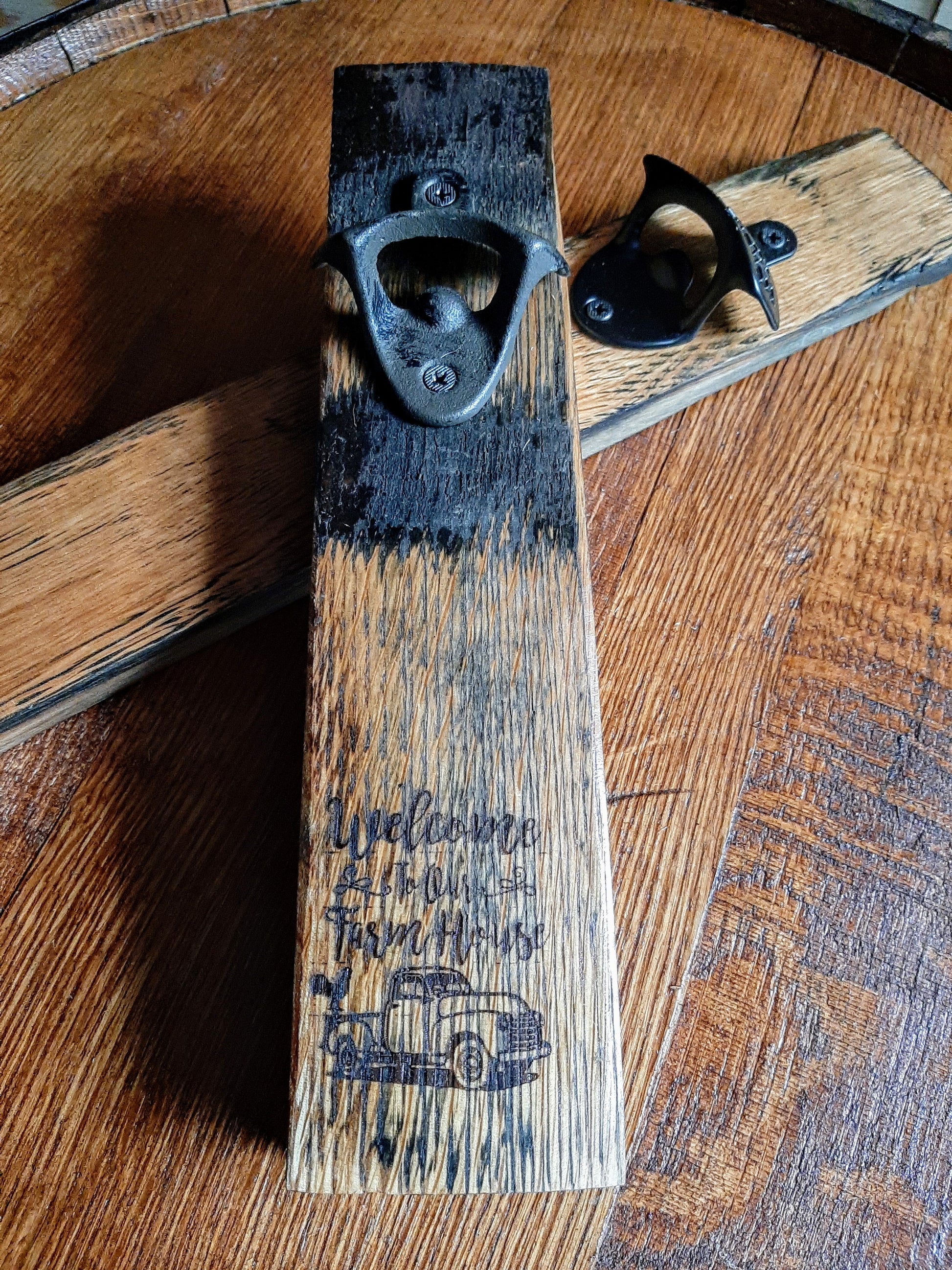 This bourbon barrel stave wall mount features a laser engraved "Welcome to our farmhouse" design and a convenient bottle opener. Enhance your farmhouse decor while enjoying easy access to your favorite beverages. Handcrafted with expert precision and quality materials.