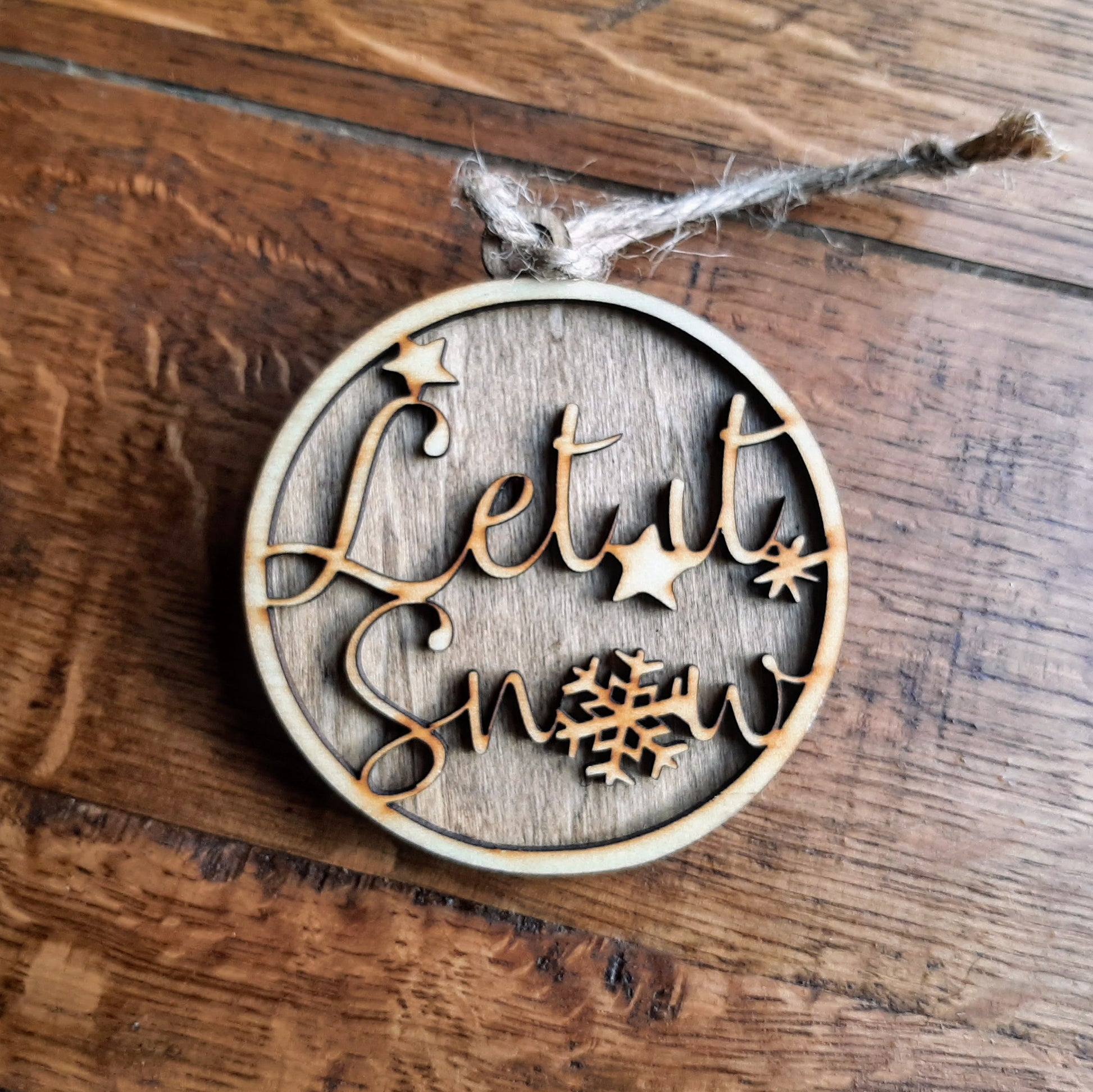 Crafted from high-quality wood and laser cut with precision, our Let it Snow Ornament is the perfect addition to your holiday decor. Celebrate the season with this beautifully designed ornament, featuring the festive phrase "Let it Snow." Add some charm to your tree and spread the holiday spirit!