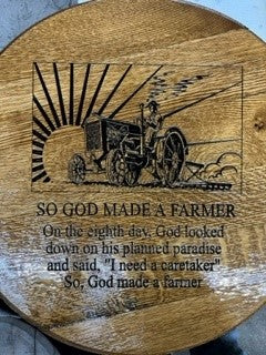 Display this beautifully hand-carved, barrel head wall hanging featuring the iconic phrase "So God made a farmer." A unique piece that pays homage to the hardworking men and women who feed our world. Perfect for adding a touch of rustic charm to any space.